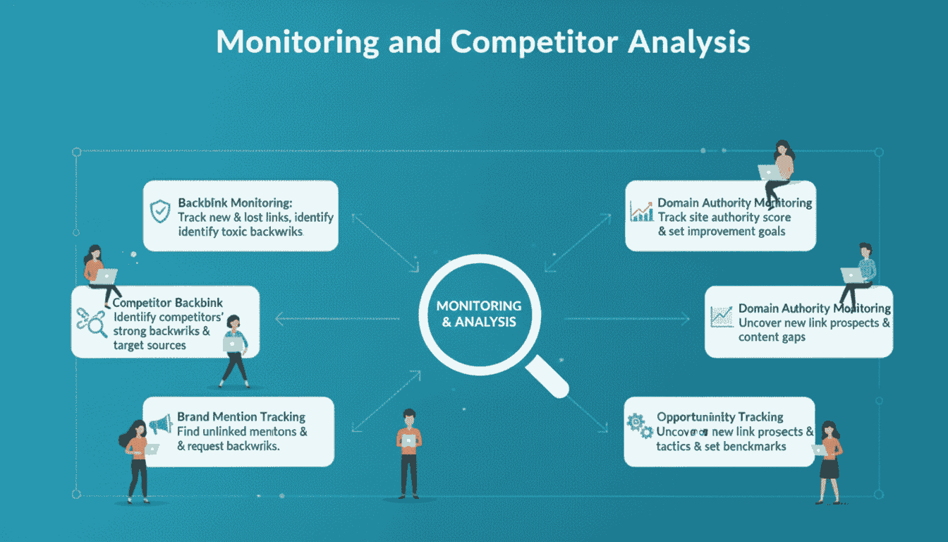 Domain authority monitoring tracks your site’s overall authority score over time. Compare your progress against competitors regularly. Set quarterly goals for authority improvement based on industry benchmarks.