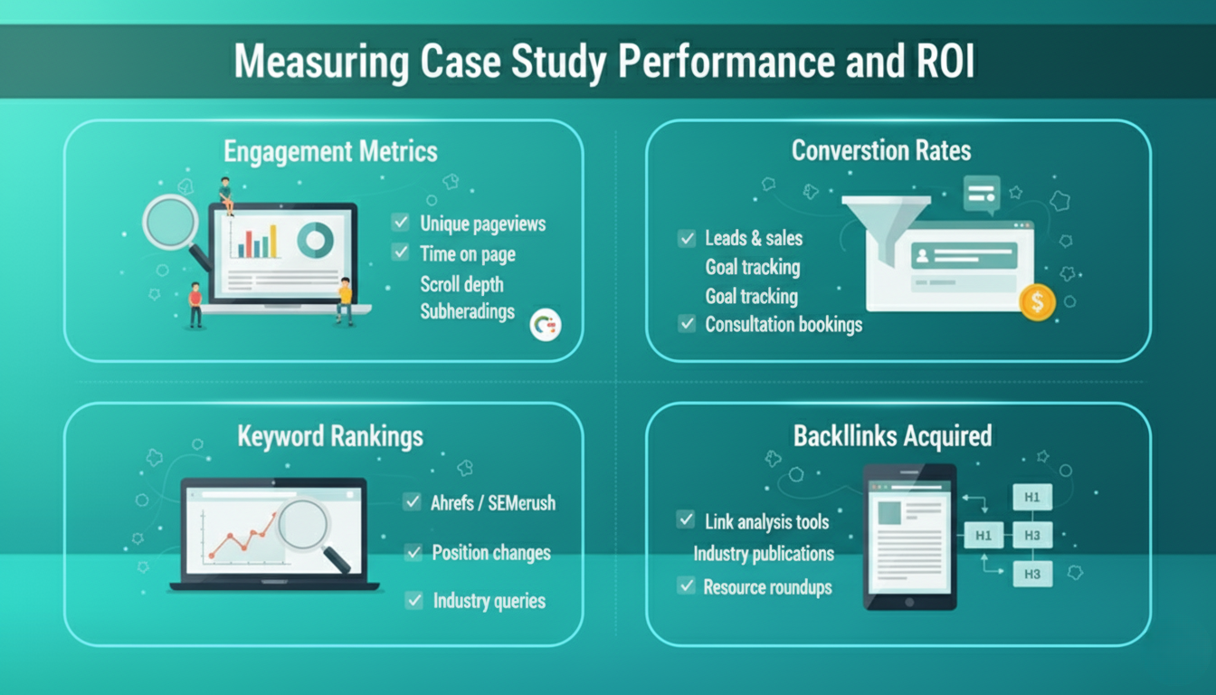 Track unique pageviews, time on page, and scroll depth for each case study. High engagement metrics signal valuable content to search engines. Use Google Analytics 4 to monitor these behavioral signals over time.