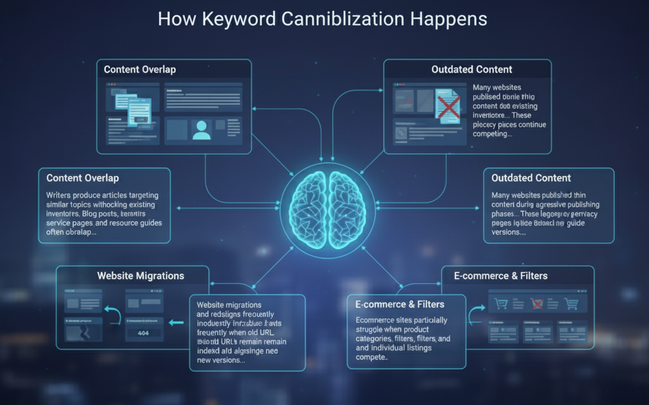 Website migrations and redesigns frequently introduce cannibalisation when old URLs remain indexed alongside new versions. Parameter variations, print versions, and mobile specific URLs can also create duplicate targeting issues. E commerce sites particularly struggle when product categories, filters, and individual listings compete for the same commercial keywords.