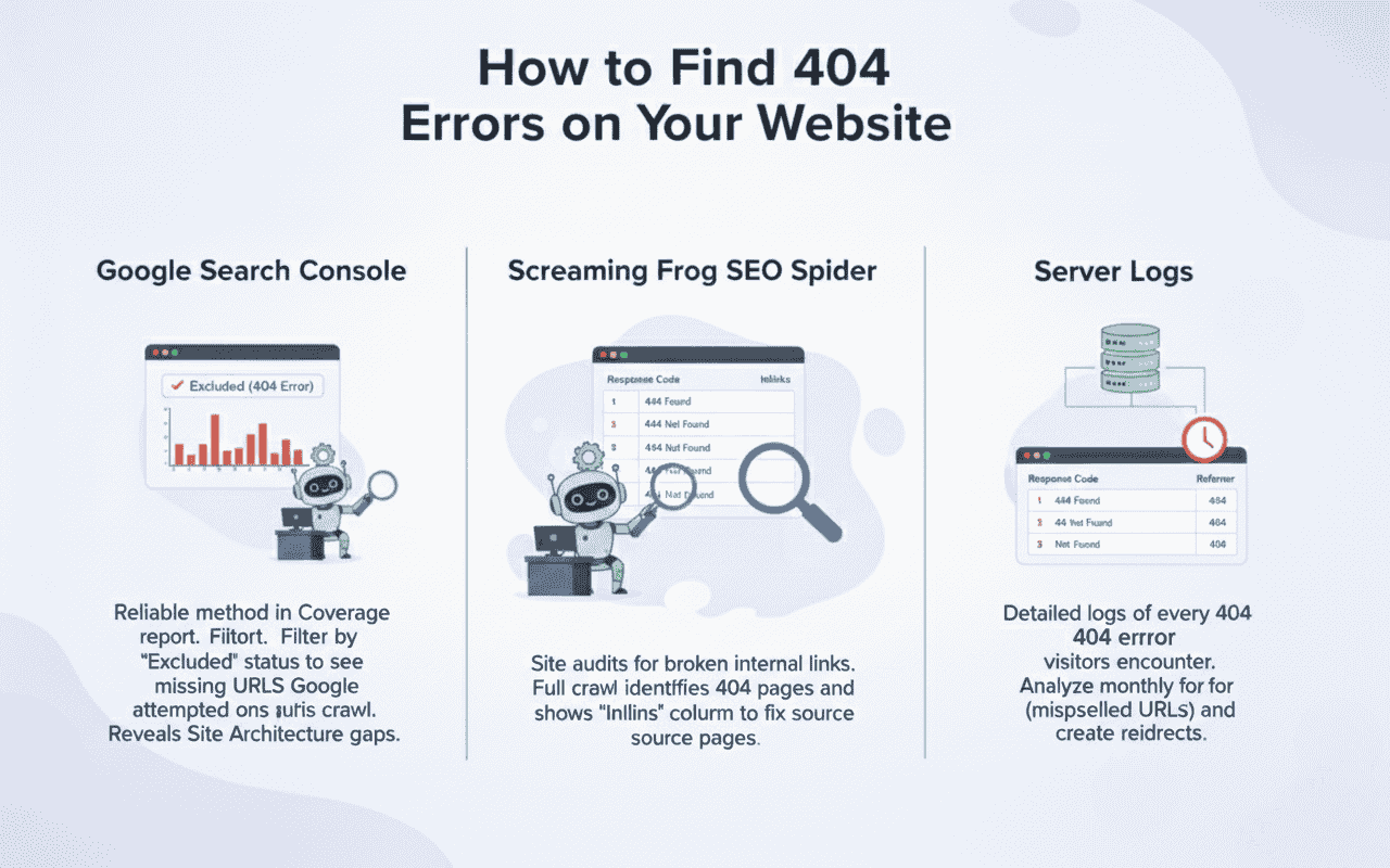 Google Search Console provides the most reliable method for discovering 404 errors that affect your search performance. Navigate to the Coverage report and filter by “Excluded” status to see pages returning 404 errors. This report shows exactly which URLs Google attempted to crawl but found missing, which also highlights gaps connected to Site Architecture.